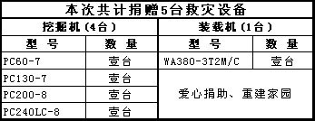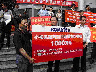 2008年5月(yue)12日,四川(chuan)省汶(wen)川(chuan)縣(xian)發生(sheng)8.0級特大地震(zhen),給當地造成重大人員傷亡和(he)財產損失。小(xiao)松(song)集團在第一時間緊急援(yuan)助(zhu)災區1000萬(wan)元,其中包括RMB600萬(wan)元現金(jin)及(ji)價值400余萬(wan)元的災區救援(yuan)重建(jian)急需的工程機(ji)械設備。