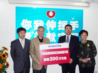 2010年4月14日,青海(hai)省玉樹(shu)藏族(zu)自治州玉樹(shu)縣(xian)發生7.1級地(di)震,造成大量人員傷亡和房屋倒塌(ta)。為幫助災區(qu)人民抗震救災,小松(song)(中國)投資有限(xian)公(gong)司代表小松(song)集團各關聯公(gong)司及全體(ti)員工,通(tong)過上海(hai)市慈善基(ji)金會向災區(qu)捐助人民幣200萬元。